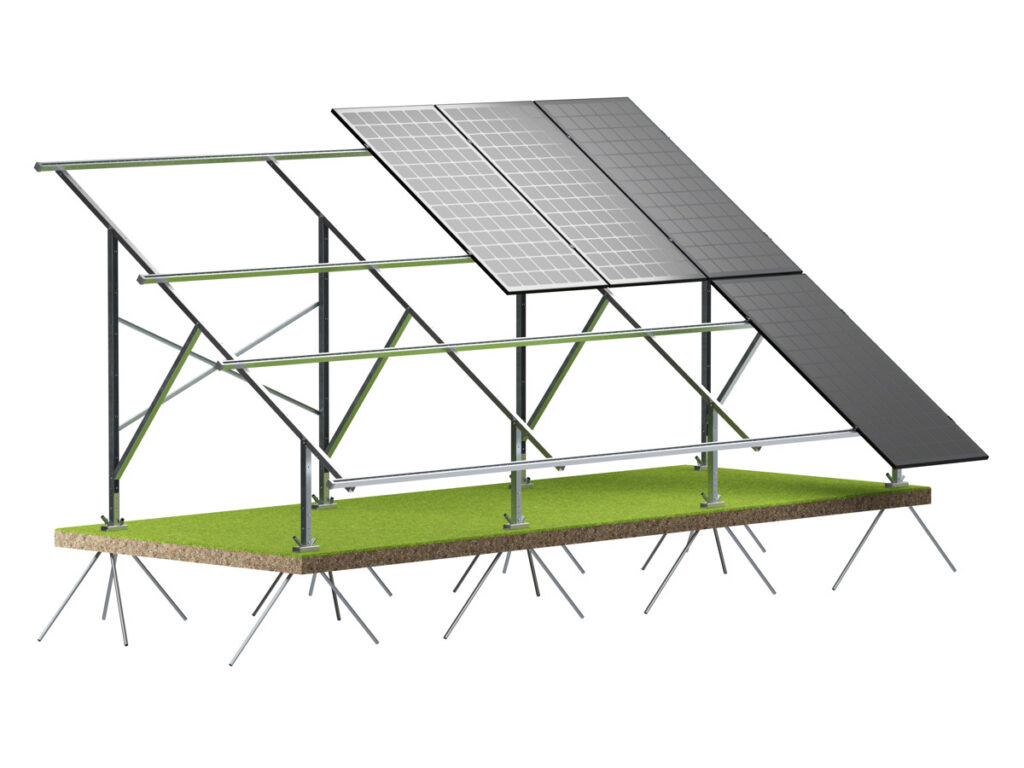 Förankringen sker via rotrör, en etablerad metod för markmonterade solcellsstativ, och den platta, justerbara foten gör systemet väl anpassat för ojämna markförhållanden mot exempelvis berg eller för gjutna plintar och plattor.