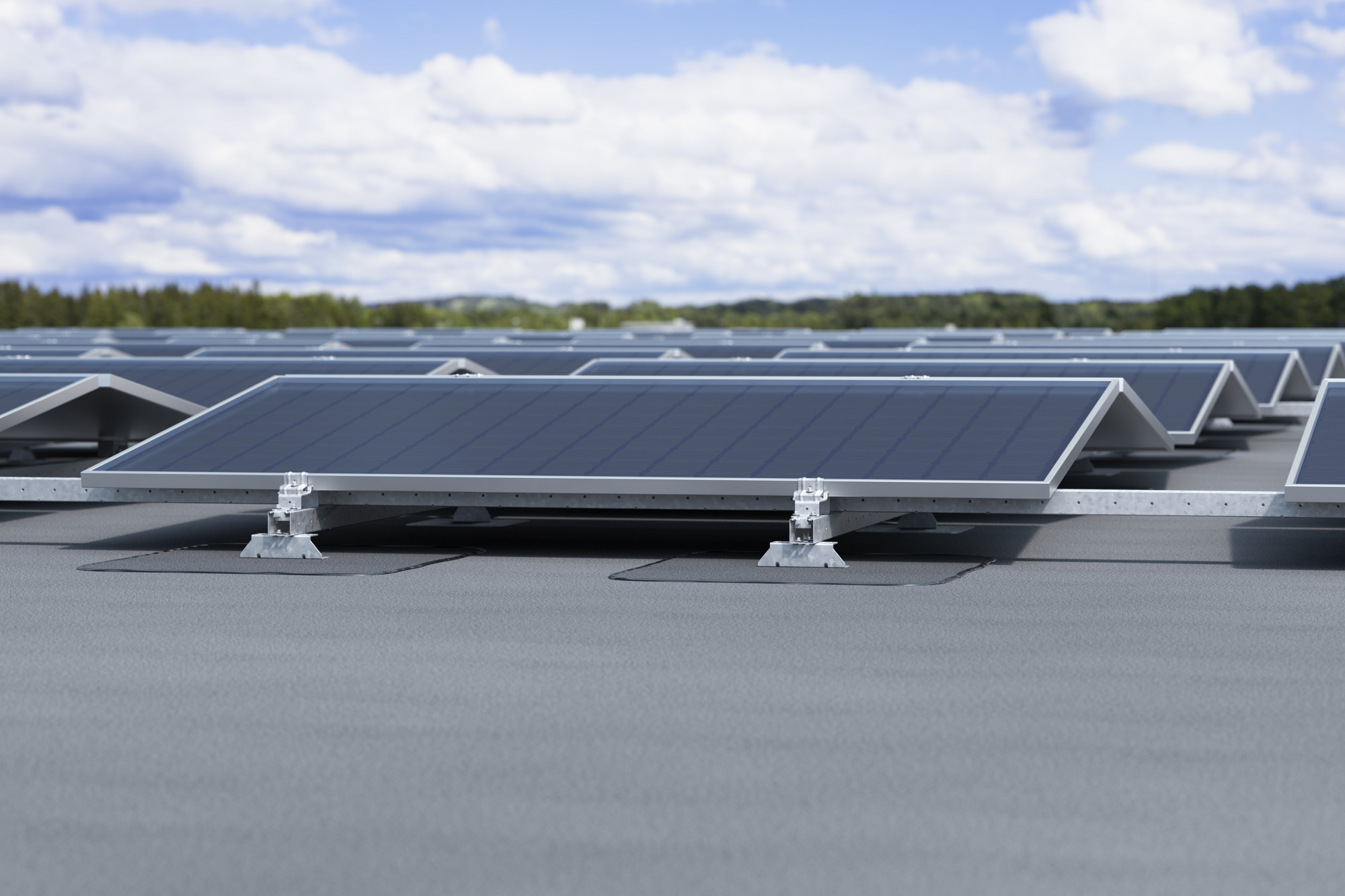 Lavtbyggende system for øst/vest montasje for optimal vinkel mot solen og sikker vannavrenning. I systemets innfestingspunkter festes solcellepanelene i en lav brakett foran og en høy brakett bak. Brakettene monteres på skinne, noe som gir et sammenkoblet system med få innfestingspunkter. Brakettene er også klargjorte for oppheng av kabelskinner.