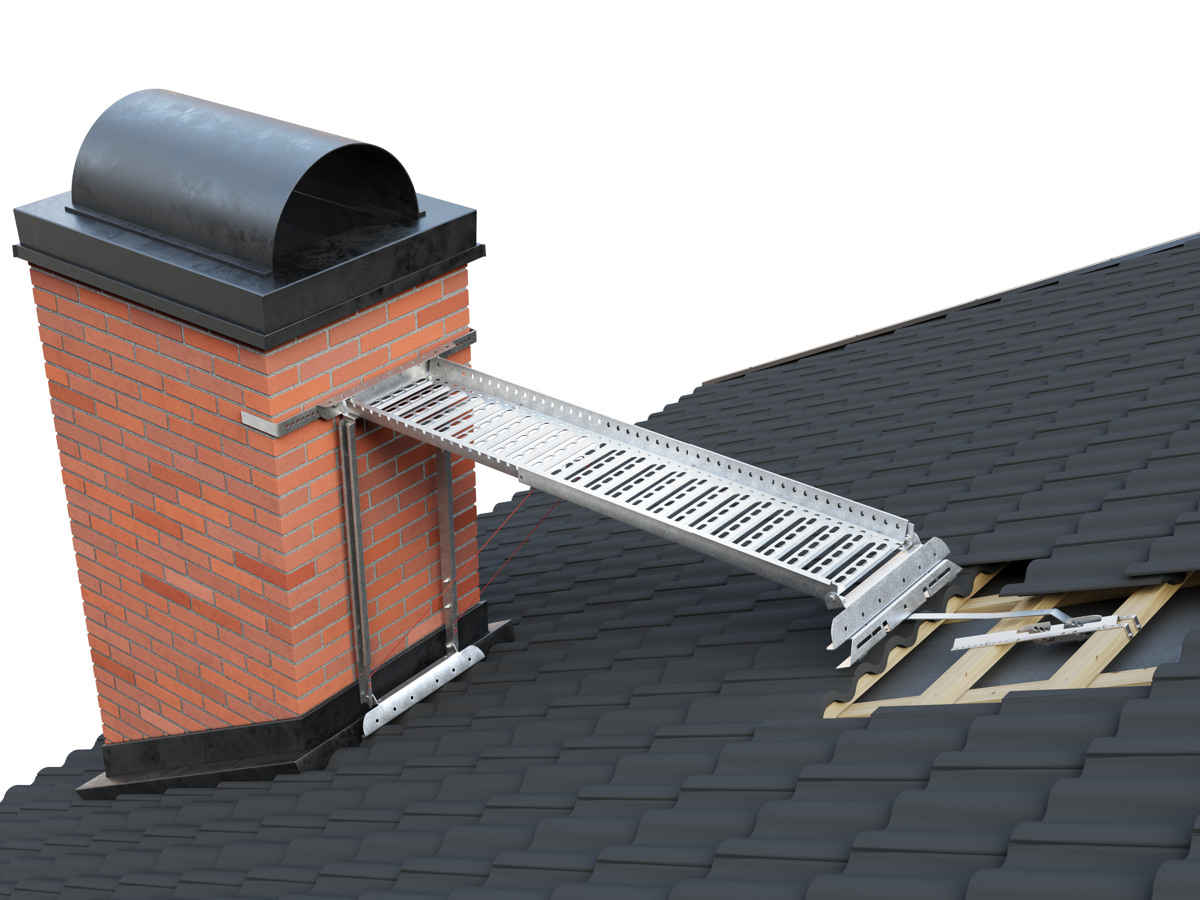 Den nedfellbare skorsteinsplattformen er en anvendelig og fleksibel løsning for å arbeide sikkert ved skorsteinen. Skorsteinsplattformen leveres komplett med bro og støttebein, og kan justeres for å passe ulike takhellinger og skorsteinshøyder. Om plattformen i oppfelt posisjon ligger mer enn 1 meter under toppen av skorsteinen bør stige med plattform brukes.