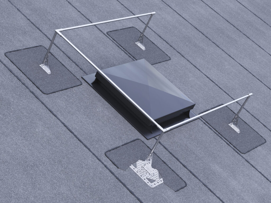 Skyddsräcket har ett längsgående rör och stolpar monterade till takfästen som väljs utefter takmaterial. Det är sammanhängande i hörnen och kan monteras i vinkel, på tre sidor eller runt om takfönster. Max avstånd mellan stolparna är 1500 mm. Utförande enligt SS 831333.