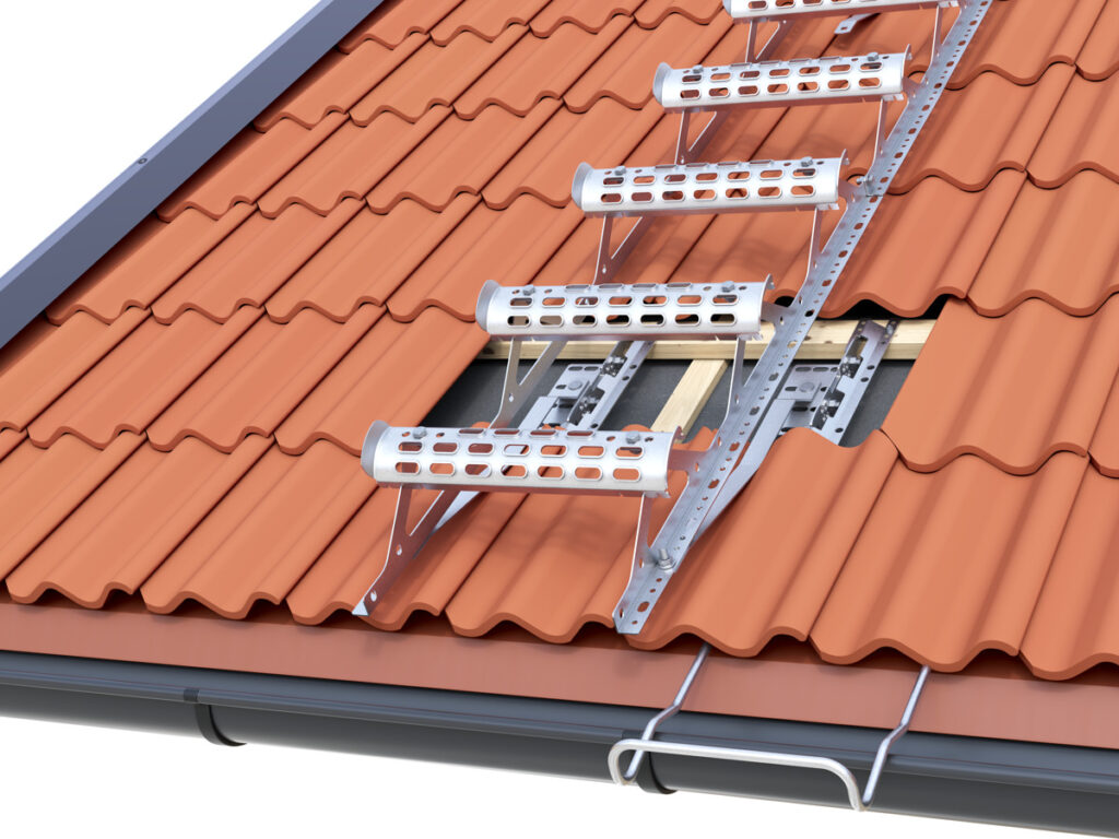 En flexibel stege med en stark och lätt konstruktion. Stegytan är välvd med kragade hål för att ge ett bra fotfäste vid olika taklutningar. Stegens bredd anpassas enkelt vid montage för att anpassas till olika typer av tak.