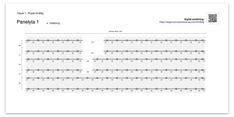 Rapporten innehåller en QR-kod och direktlänk till en digital utsättningsplan där montörer kan zooma, välja tak och tända/släcka mått vilket är perfekt för mobil eller surfplatta.