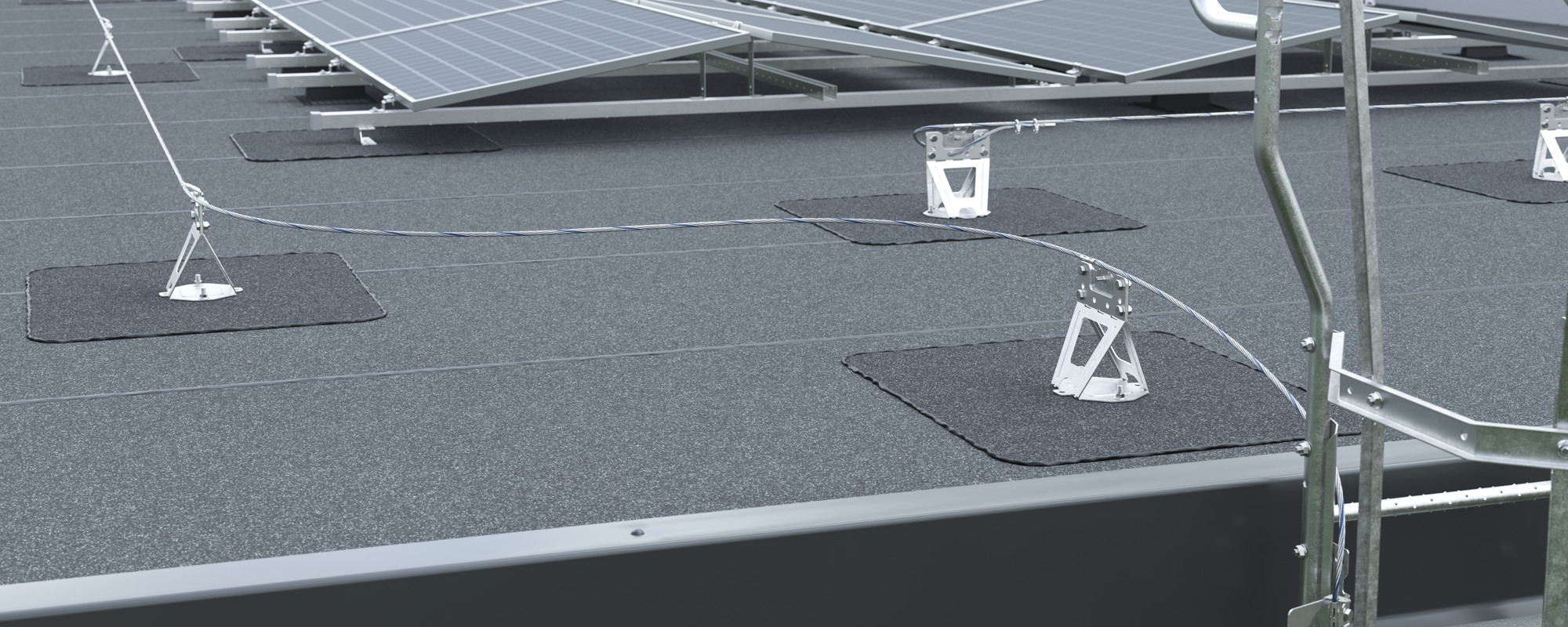 Weline ONE är ett smidigt, vajerbaserat fallskyddssystem som fungerar vid både nyproduktion och komplettering av befintliga tak. Det kan monteras på släta eller lutande papptak och integreras direkt med Weland Ståls taksäkerhetsprodukter som takbryggor, takstegar och nockräcken.